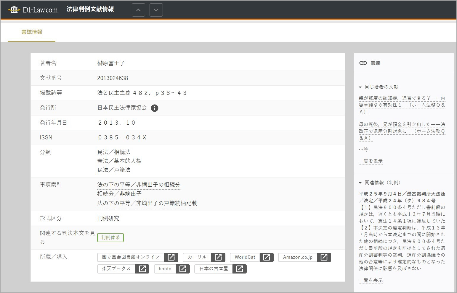 ●幅広い収録対象誌(図書、雑誌・研究紀要等)から選んだ法関連文献と判例の書誌情報を収録しています。