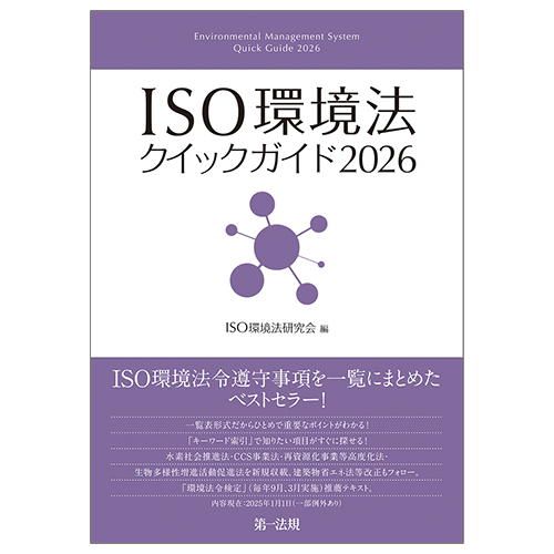 『ISO環境法クイックガイド』最新版。主要環境法令88法を見やすい一覧表形式で収録。手間をかけずに罰則や遵守事項を確認可能、スマートな環境管理を実現。2026年1月1日現在(一部例外あり)。