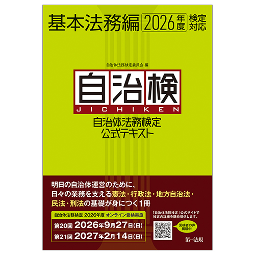 地方分権時代の自治体職員に必要な法務能力を問う「自治体法務検定 基本法務」の公式テキスト、2026年度検定対応版。行政法、地方自治法をはじめ、自治体の実務全般に共通して関連を有する法分野である憲法や民法、刑法の知識を網羅し、自治体職員が共通に備えるべき法務知識を学ぶ基本法務編。
